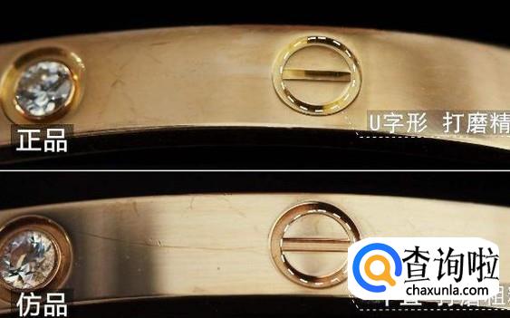卡地亚手镯外有一些O形,O形里有一条横杠,正品的横杠偏“U字”形,而且打磨得很细致,仿品的横杠是平直的,看起来很粗糙。