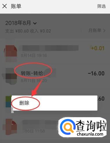 进入之后,按住想要删除的转账记录,就会弹出删除按键,然后点击“删除”即可,如图所示。