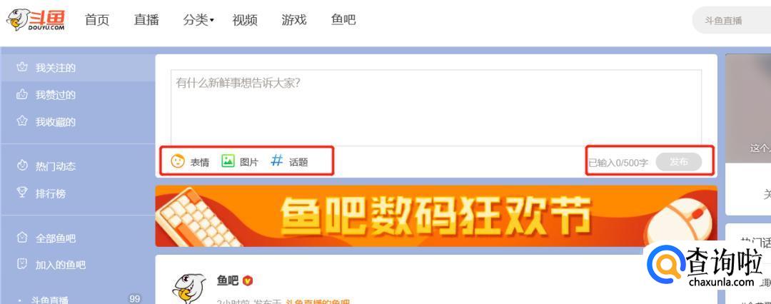 进入到鱼吧之后就能看见你所关注的主播发的动态,是看不见没有关注的主播的动态。