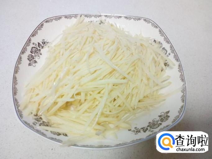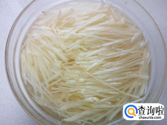 土豆去皮用水清洗干净,切成丝,放入水中浸泡一会,去除上面的淀粉成分。然后用水冲洗一下,控干水分。