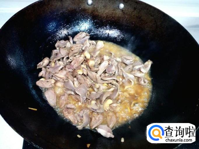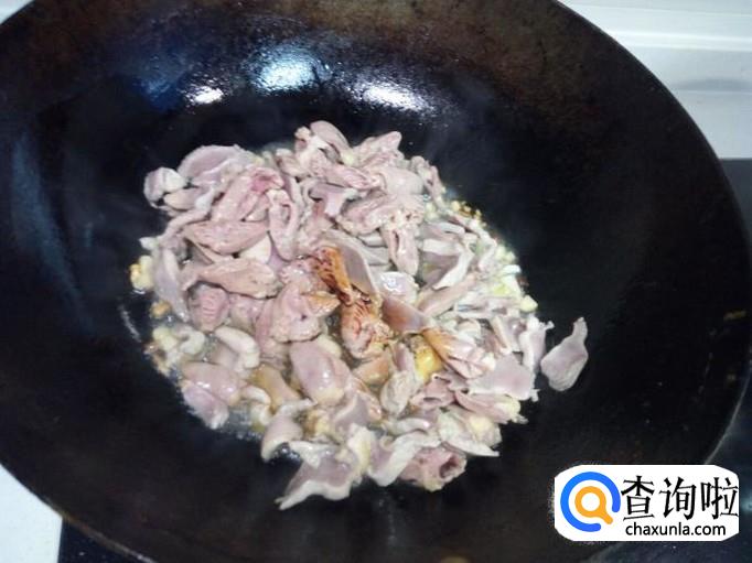锅内放入油加热,油热后放入花椒,葱,姜,蒜,爆锅。放入鸡心,鸡胗,翻炒,放入料酒,少许酱油。