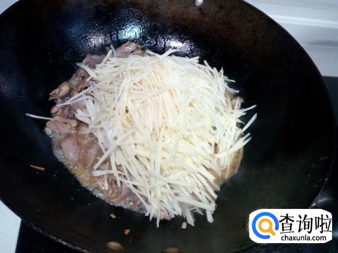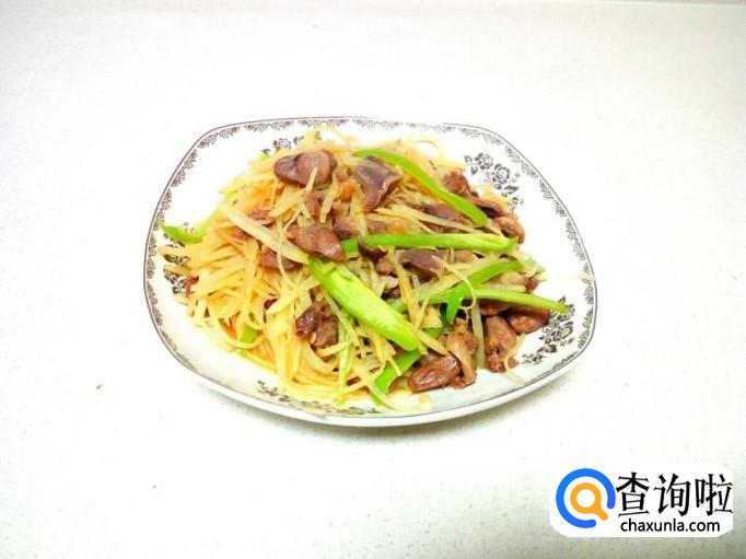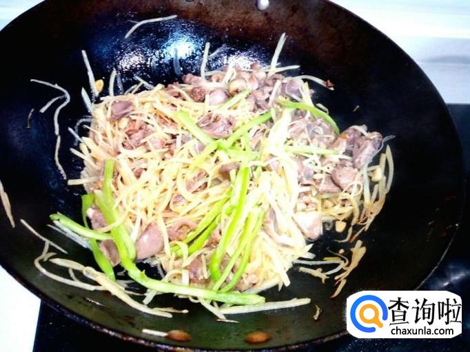 鸡心,鸡胗,略翻炒一下就可以,然后放入土豆丝,放入少许醋,盐,大火快速翻炒。