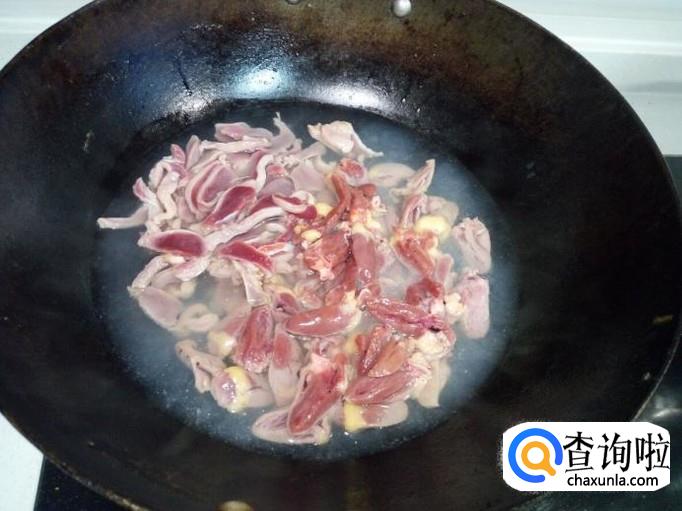 把鸡心,鸡胗,用开水汆一下(一起放入锅中),入锅几秒钟即捞出,用冷水冲洗干净(上面的血水和沫子),沥干水分。