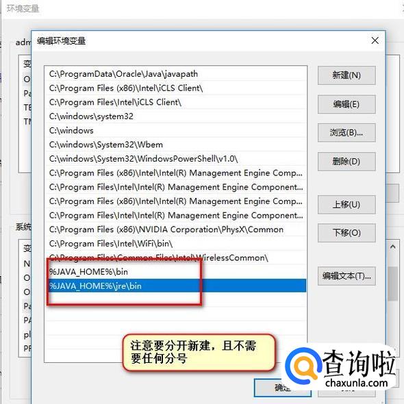 接下来我们修改系统的Path环境变量,注意这一步正是Win10和Win7或Win8系统不一样的地方,我们双击Path的值,此时看到的不再是用分号隔开的若干个设置,而是变成了单独的每一个设置在不同的行。此时我们需要将jdk和jre的bin位置设置在两行,而不可以像有的教程中介绍的写在一起用分号隔开(例如%JAVA_HOME%bin;%JAVA_HOME%jrebin;)这种错误的写法,否则在命令行执行javac命令时将会看到‘javac’不是内部或外部命令,也不是可运行的程序或批处理文件的提示。