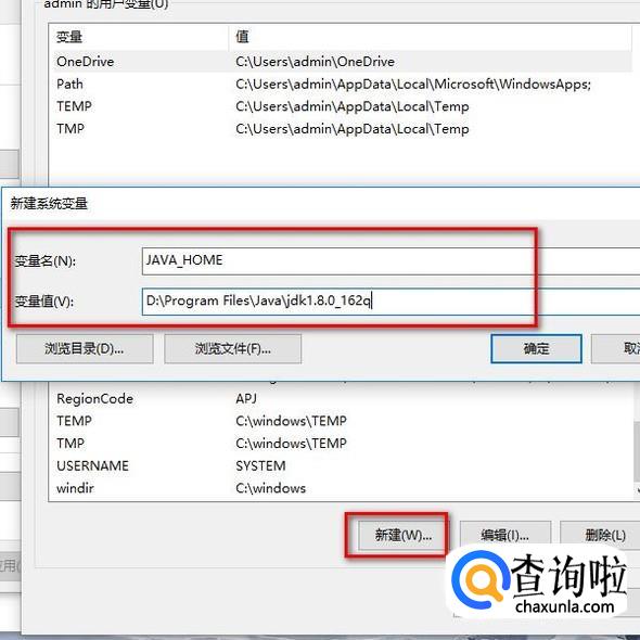 我们新创建一个JAVA_HOME的环境变量,变量值为上述步骤JDK的安装路径,D:Program FilesJavajdk1.8.0_162,如下图所示。