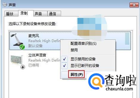 如果大声喊了一下,还是很低的话,那就需要设置了,右击麦克风,选择属性。