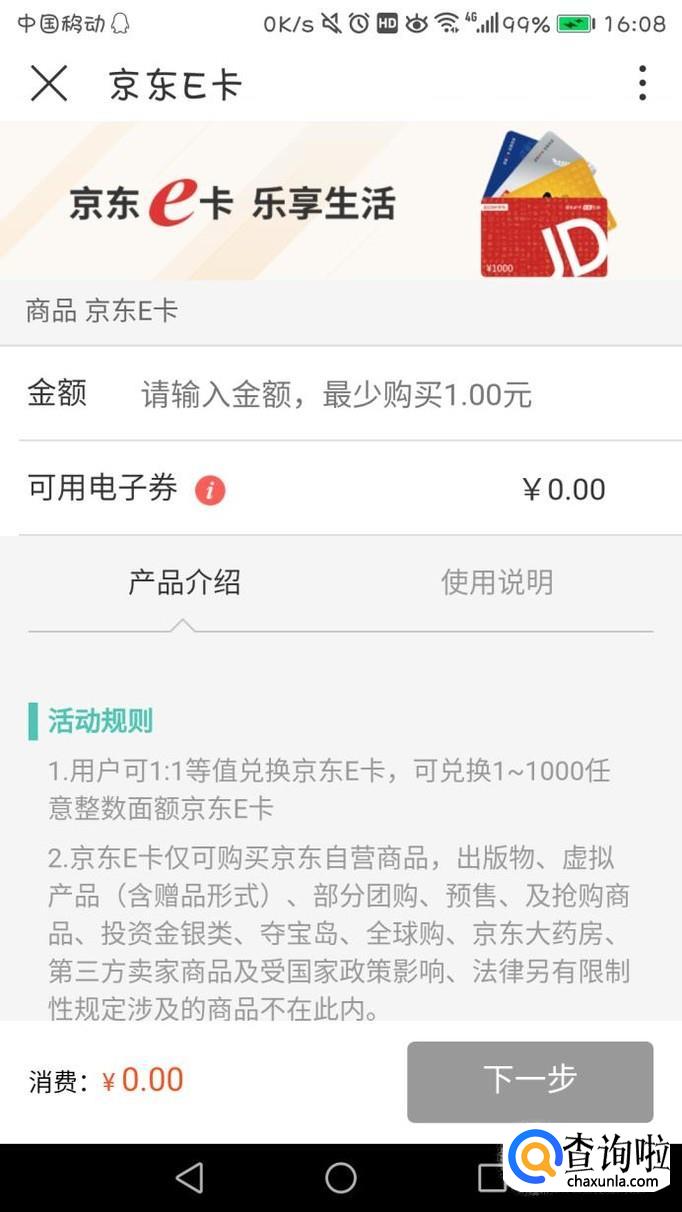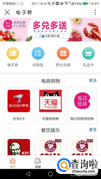 同时也可选择下方的“电商购物”,点击进去可以用电子券兑换京东E卡等,就可直接线上消费购物了。