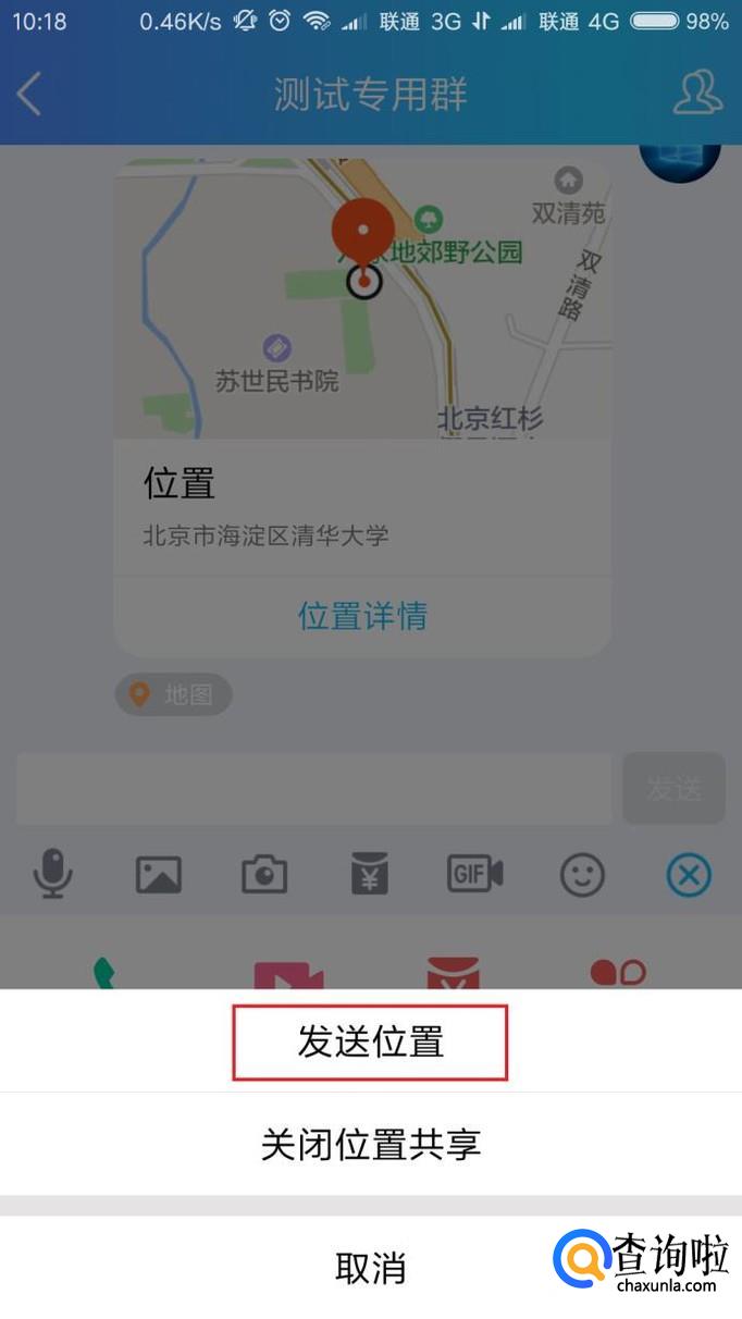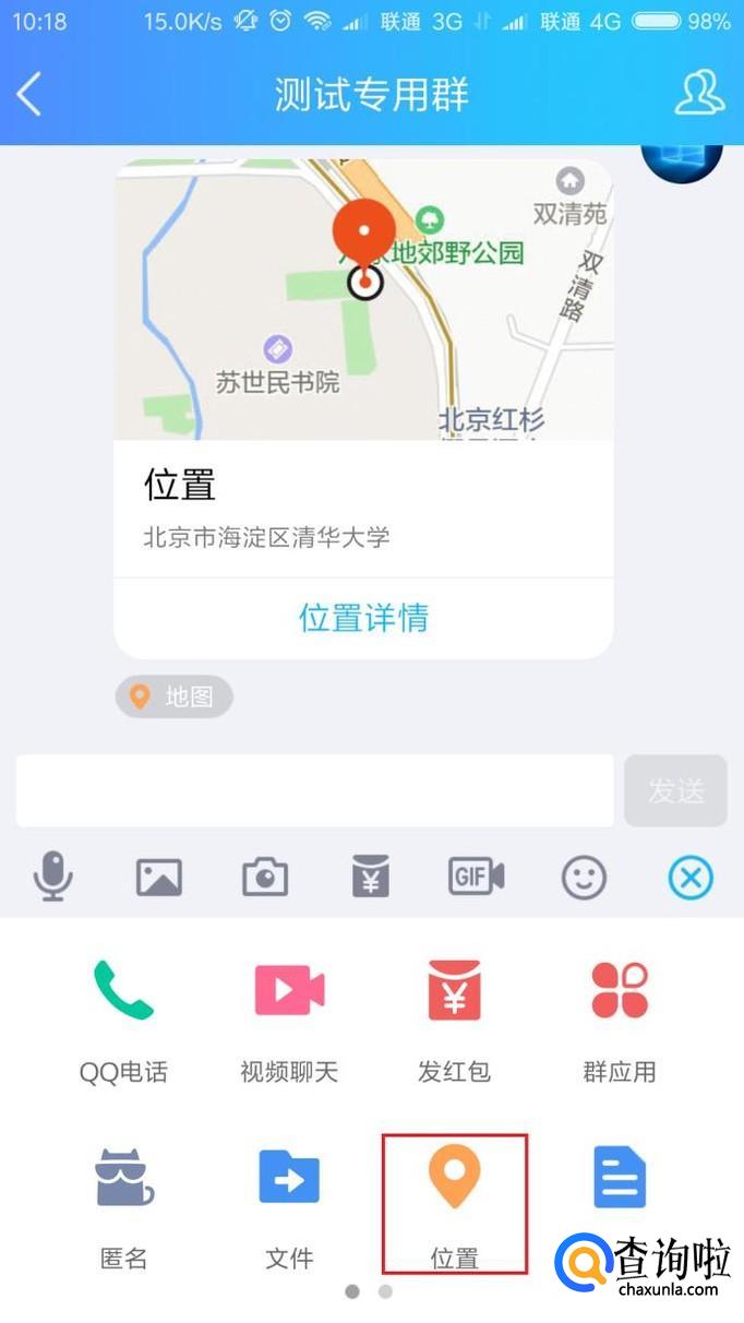 接下来,我们点击“发送位置”按钮,将当前手机所处的位置发送给好友。