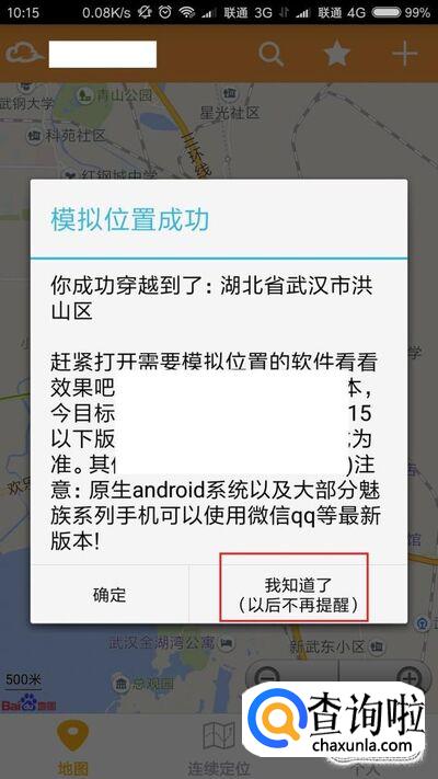 接下来,软件弹出消息提示窗口,在窗口页面中看到提示我们当前已经穿越到了湖北省武汉站,我们可以测试一下。