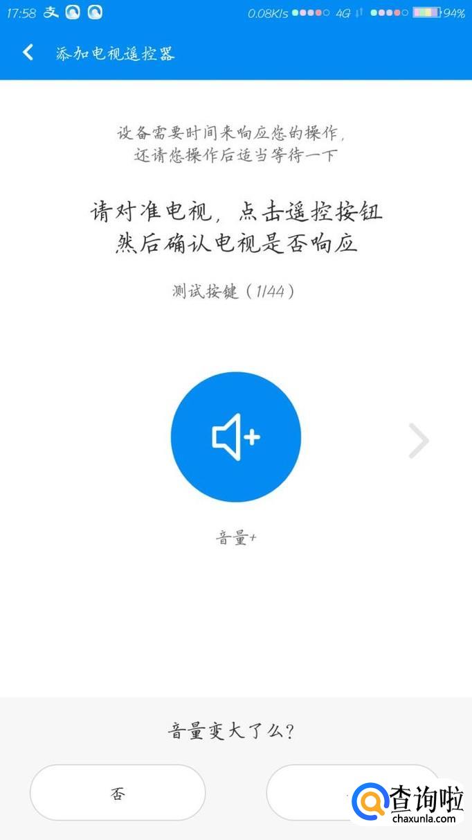 记得选择的时候手机红外发射装置要对准电视机的接收器,然后依次按键确认电视机是否有反应,有反应点"是",无就点"否"。