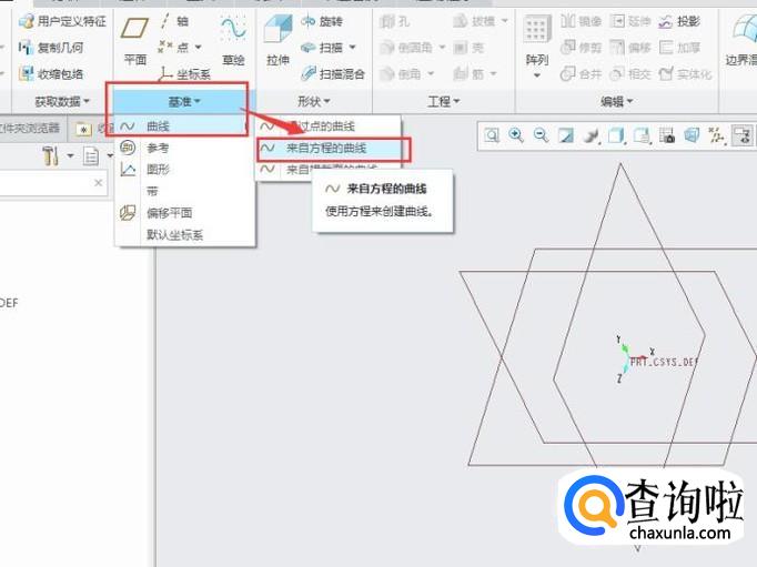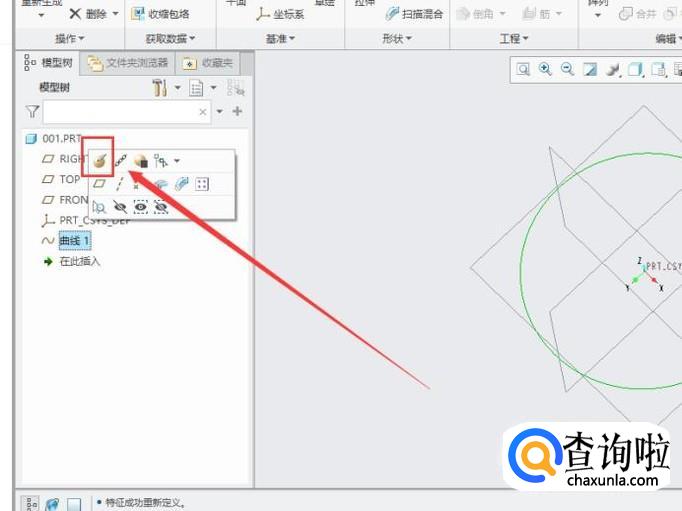 若是想修改创建的方程曲线,在左侧的模型树选中创建的方程曲线,然后右击选择编辑定义即可对曲线方程进行修改,如图所示。