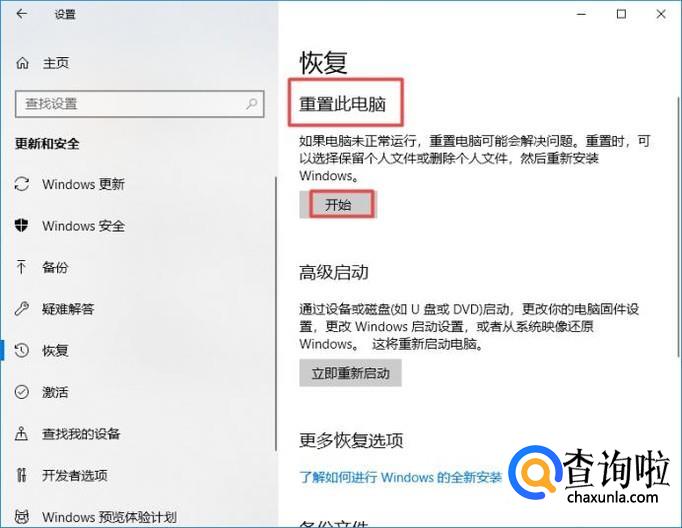 之后我们点击重置此电脑下方的开始;