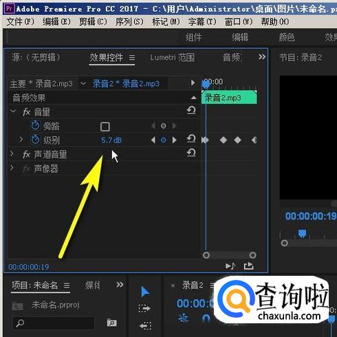 我们目光再看界面左上方的效果控件面板这里,这里有音量设置选项。