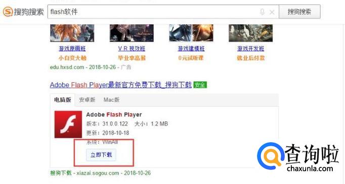 通过搜索工具搜索“flash软件”,在搜索结果中点击如图位置“立即下载”按钮。