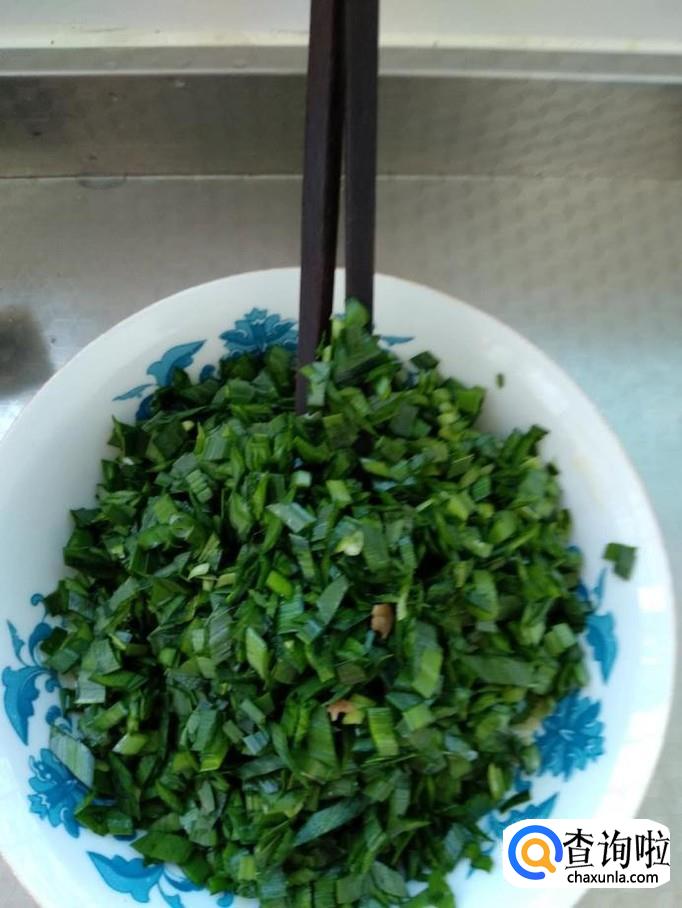 将韭菜段倒入蛋液中,进行搅拌。搅拌后,根据咸、淡等口感,再次加入食用盐适量,同时加入适量的十三香。