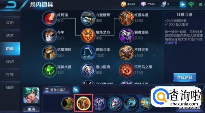 第二件装备我们可以选择出红莲斗篷,这个装备有很高的物理防御,其次还能加我们的血量,这样我们就有能力更好的保护我们的射手了,血量高往往也就不容易死了。