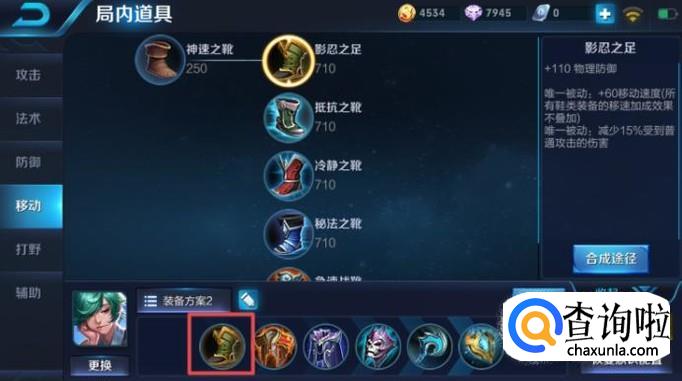 庄周作为辅助的话,第一件装备我们最好选择出影忍之足,这个装备有很高的物理防御,作为辅助,我们的防御能力还是要有的,不然是无法保护我们的射手的。