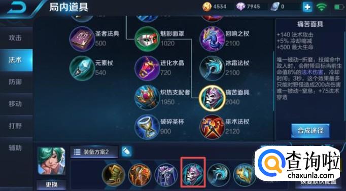 第四件装备我们可以出痛苦面具,这个装备除了加血之外,还有法术伤害,此时的庄周还是需要一定的攻击能力的,不然是无法保护我方的射手的。