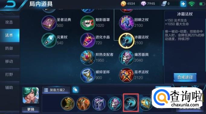 第五件装备我们可以出冰霜法杖,这个装备的好处在于可以加法术攻击,其次还能加血,此时加上这些血量之后,我们的庄周基本上已经很难死掉了。