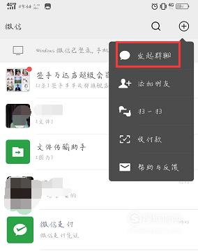 打开手机微信,点击右上角的加号,在弹出的对话框里选择“发起群聊”,如下图所示。