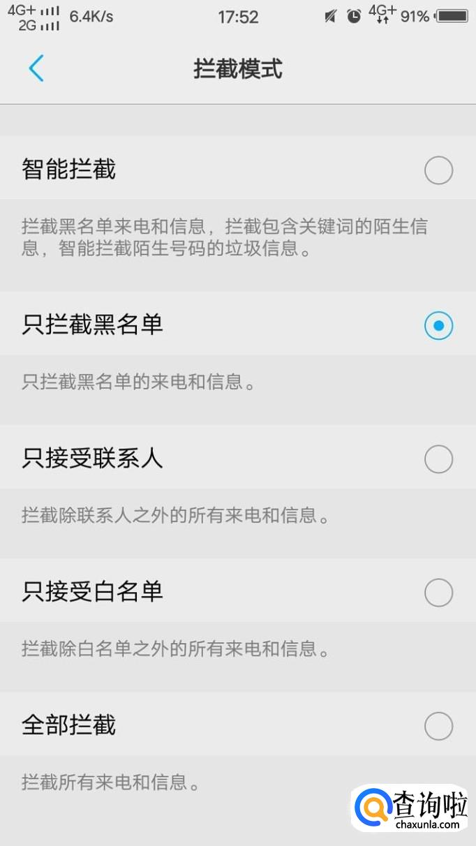 然后里面就会有很多的拦截,比如说拦截黑名单或者白名单,如果是黑白名单的话,需要你自己添加号码。当然,你也可以设置为只接受联系人的来电。