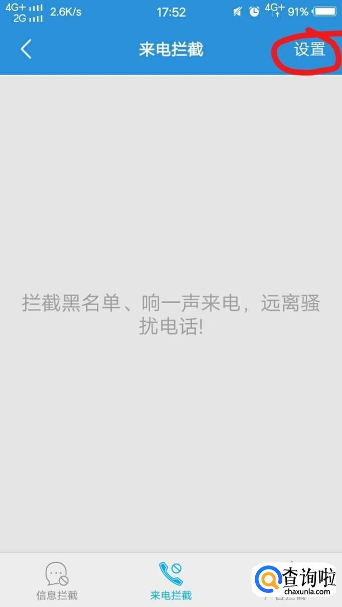 接着,我们点击“来电拦截”,再点击右上角的“设置”。