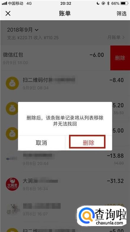 然后选择一个要删除的账单并往左侧滑动,如下图所示。