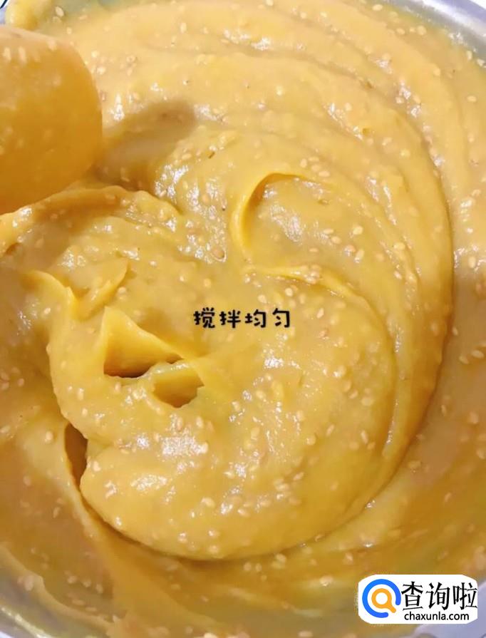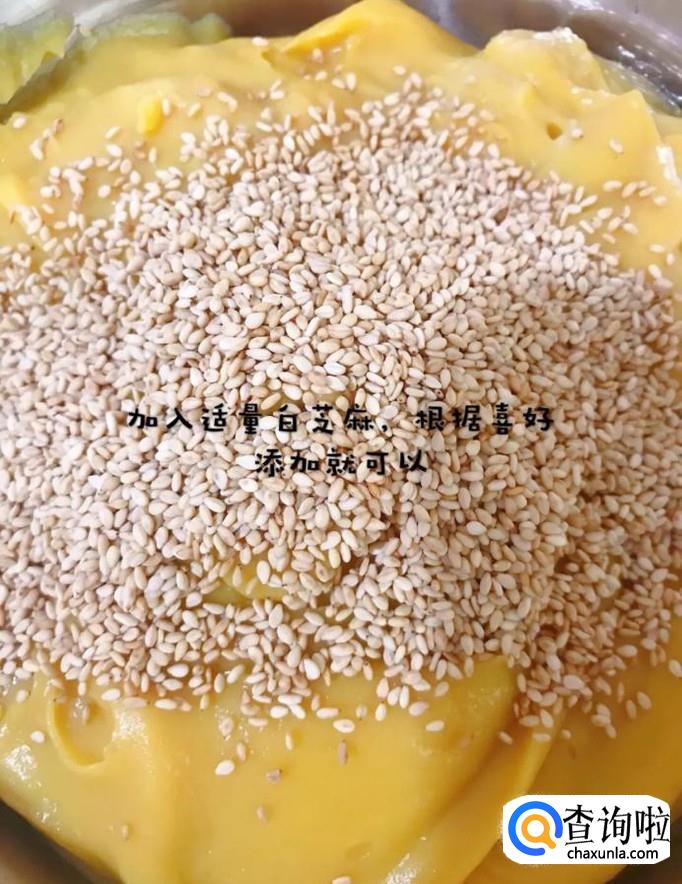 接着在地瓜泥中加入适量的白芝麻,如图所示。