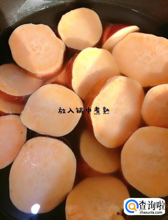 然后锅中放入适量的清水,倒入地瓜煮熟,如图所示。