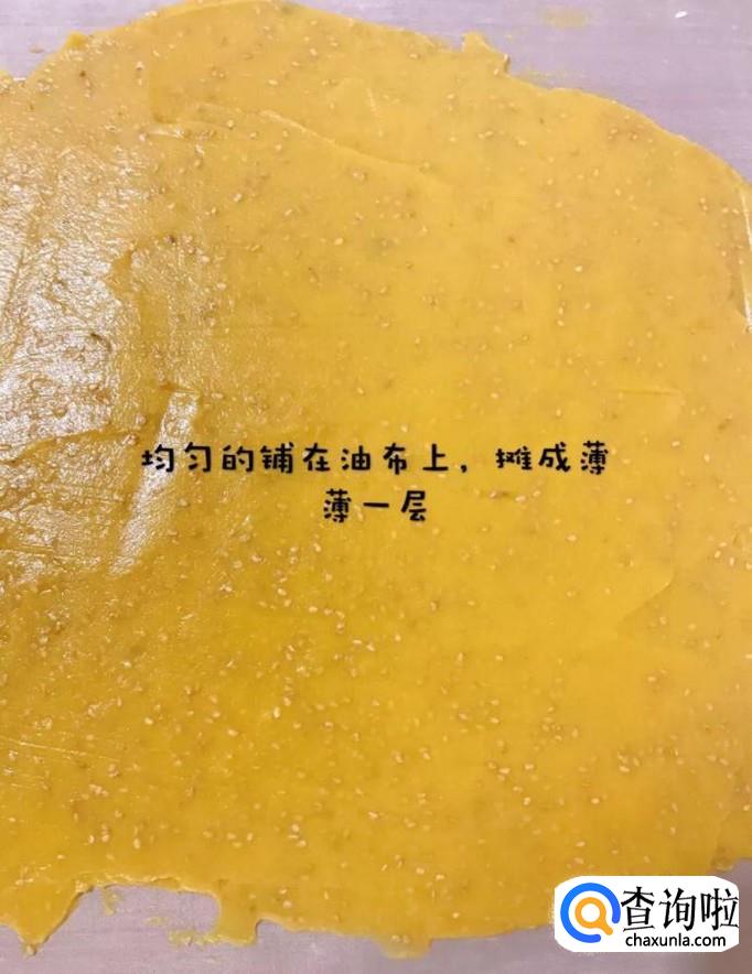 接着把地瓜泥均匀的铺在油布上,摊成薄饼,如图所示。