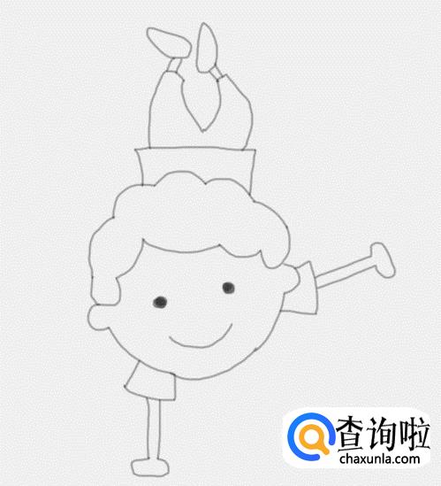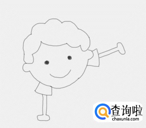 最后再在小男孩的头部上面画出小男孩的身体,再在身体的后面再画出小男孩的两条腿及脚部,这样跳舞的小男孩就画好了,如图所示: