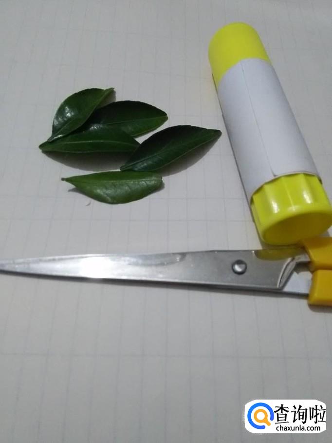 做树叶贴画,需要的材料有一张纸,几片树叶,一把剪刀,一个胶棒。