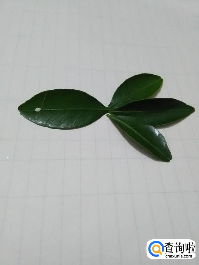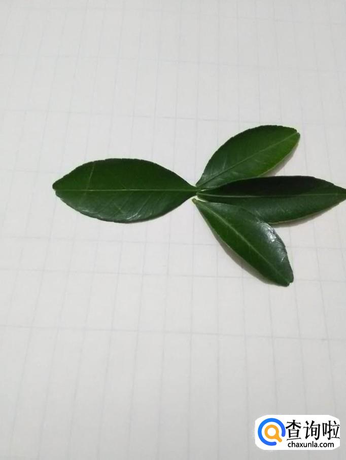 再选三片小一些的叶子,将每一片叶子的背面抹上胶棒,粘在小鱼身体的右侧,当作小鱼的三片尾巴。