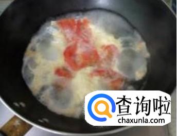 多翻炒一会儿,西红柿炒熟后会变软出汁水,这样做出来的汤才鲜香,然后加入清水大火煮开。