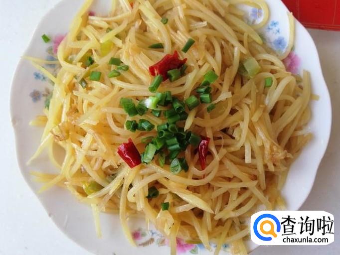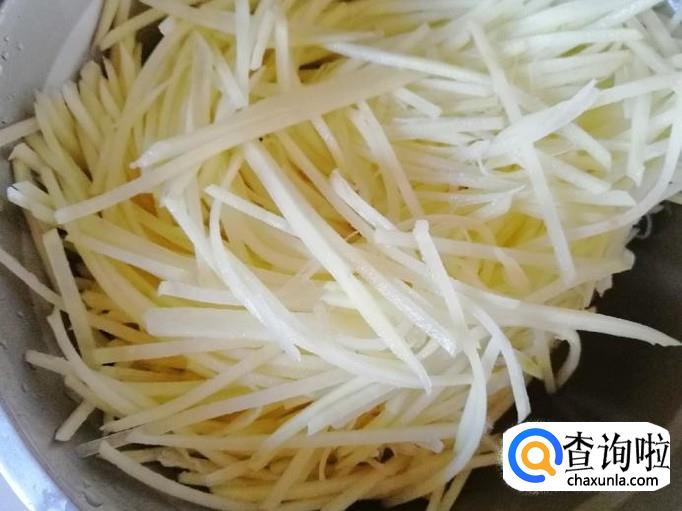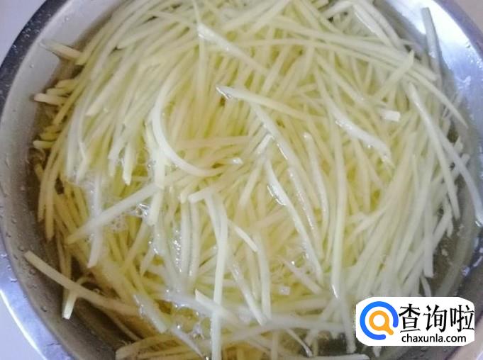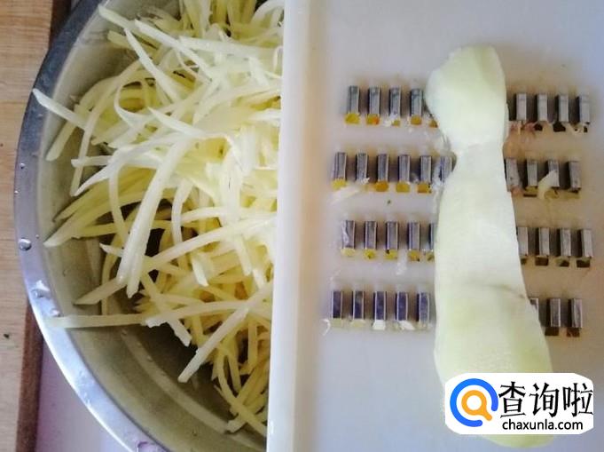 把去皮的土豆用擦子擦成土豆丝 ,擦完后用水冲掉多余的淀粉,最好是用清水泡一会,然后捞出土豆丝控水待用。