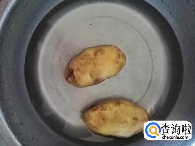 选用两个土豆,放入洗菜盆,用清水洗掉土豆外面的泥土,用刮刀把土豆皮去掉,冲洗干净待用,这里要注意给土豆去皮时,注意小心点别伤着手。