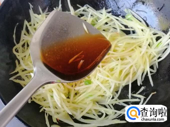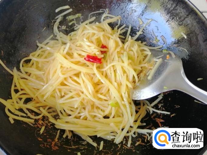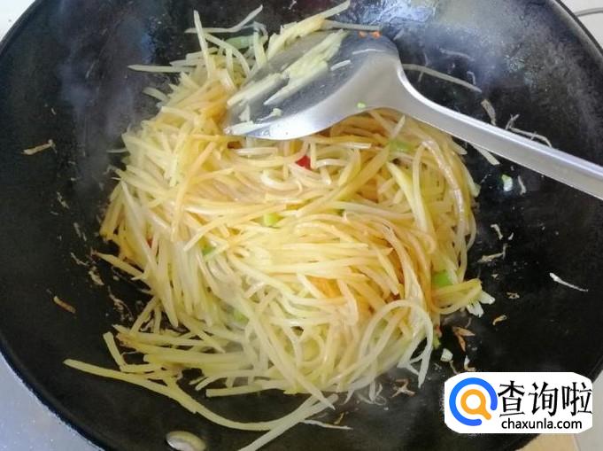 加入香醋后快速翻炒均匀,小编一边炒菜一边拍照,锅底的土豆丝都快糊了,炒至土豆丝看上去变软就可以了,确定不了生熟的可以品尝一下,炒熟后加入适量食盐,口味重的也可以加点生抽炒匀就可以了。