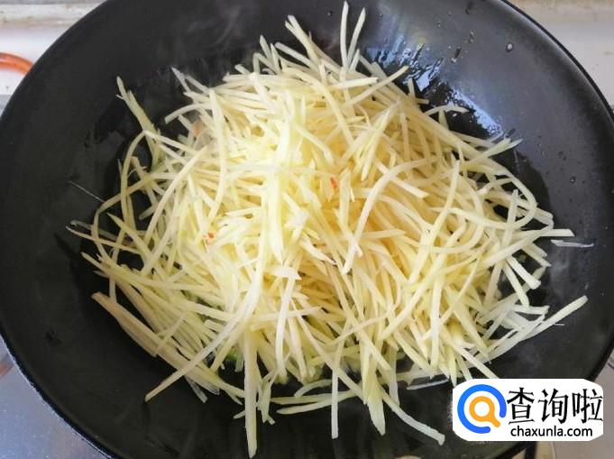 这一步准备炒菜,开火炒锅放油,油热后放入炝锅的葱、蒜、辣椒等,炒出香味后放入备好的土豆丝,快速翻炒均匀。