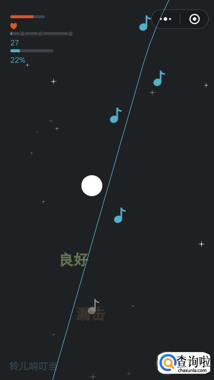 游戏开始后,界面上会出现一个小球和很多音符,我们需要点击屏幕来控制小球碰撞音符弹奏出正确的曲调,来完成整首歌曲的弹奏。
