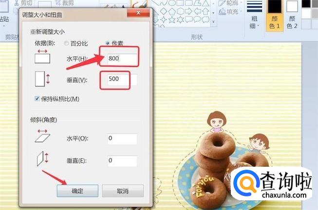 然后在水平输入框里输入800,垂直方向会自动调整大小,因为选中了‘保持纵横比’选框。
