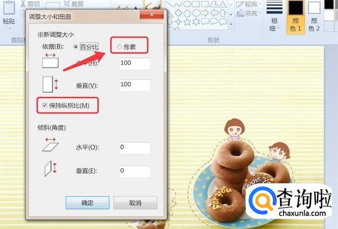 弹出窗口,先选中‘像素’选框,并选中‘保持纵横比’选框,这个是为了调整大小时,图片不变形。