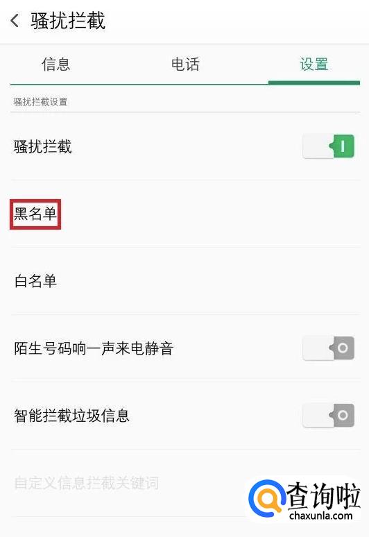 查看设置里面的电话和信息选项。里面也可以查看自己设置的黑名单。