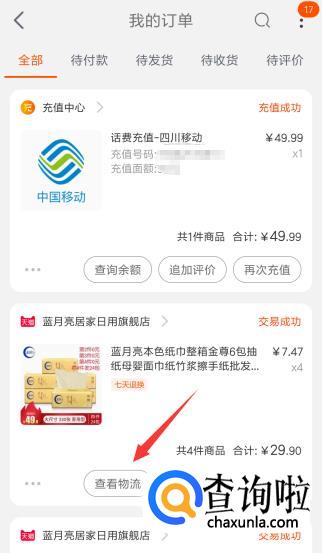 这里点击我们网购物品下方的【查看物流】。