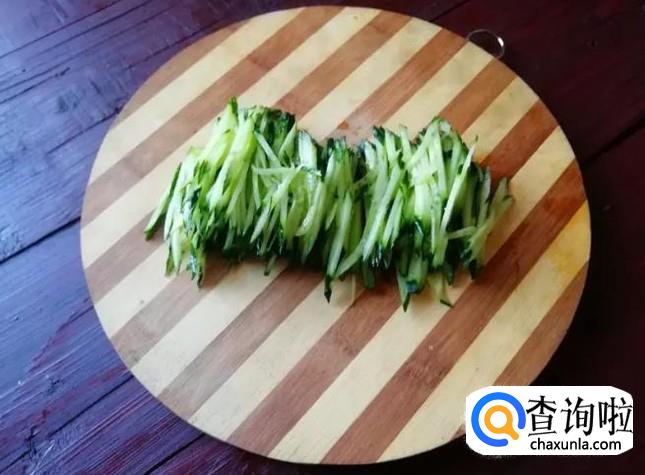 然后我们把准备好的黄瓜切成丝,如下图所示,尽量切的细一点