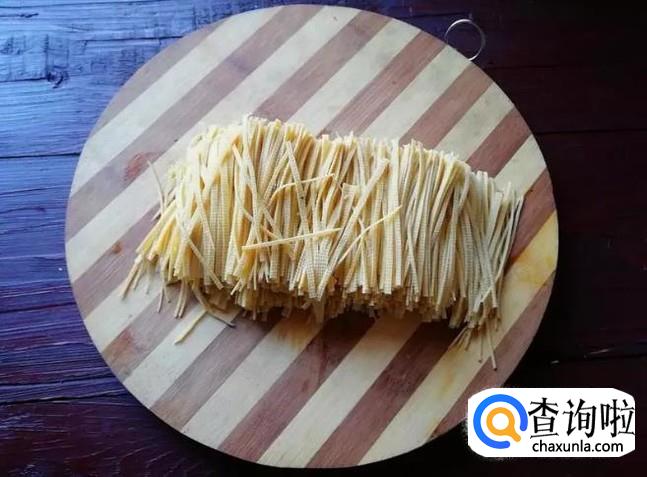 接着在把豆皮也切成丝,如下图所示,和黄瓜一样尽量切的比较细