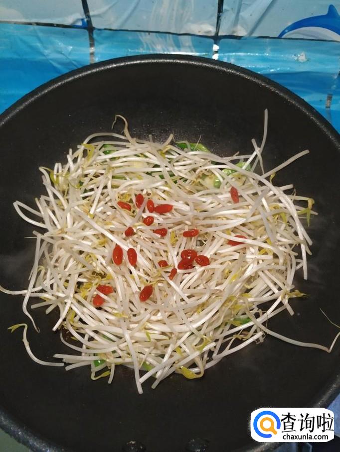 将准备好的豆芽,倒入锅中,再加入适量泡好的枸杞子,翻炒均匀。