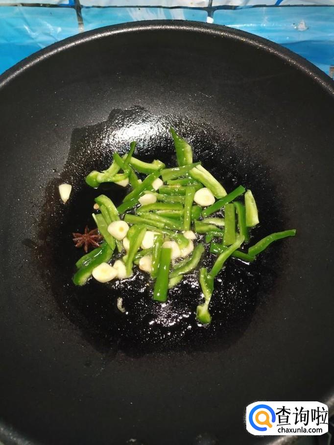 炒锅中放入适量油,油热后,放入蒜片爆香,然后将青椒倒入锅中,翻炒均匀,炒至青椒变软就可以了。