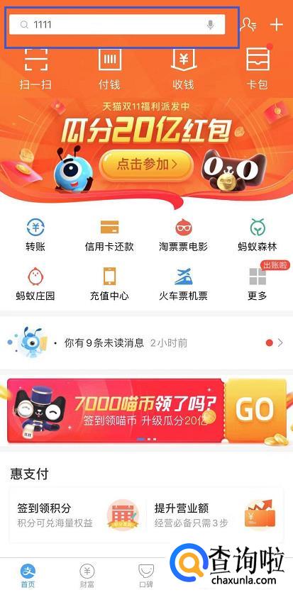 首先,打开支付宝,点击上方的搜索框。