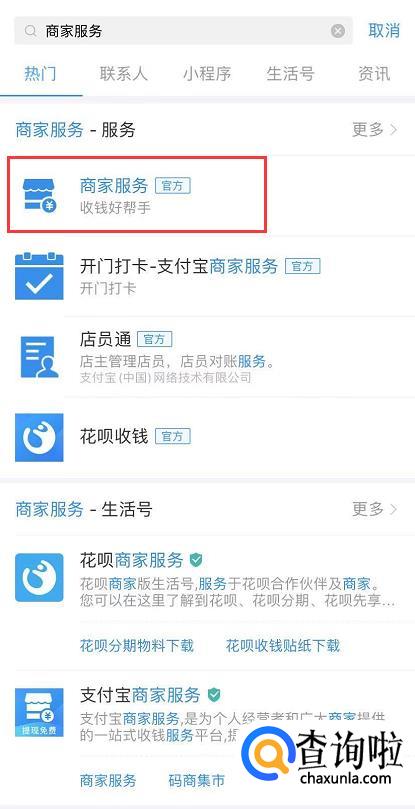 输入“商家服务”,然后点击搜索,进入商家服务。