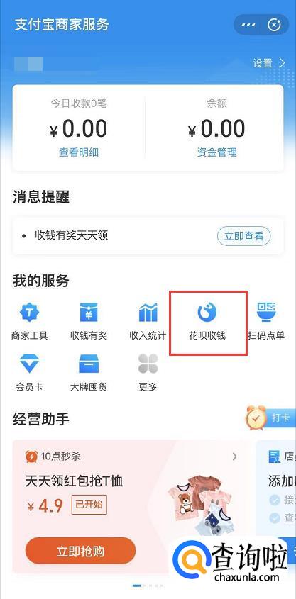 进入商家服务,点击“花呗收钱”。